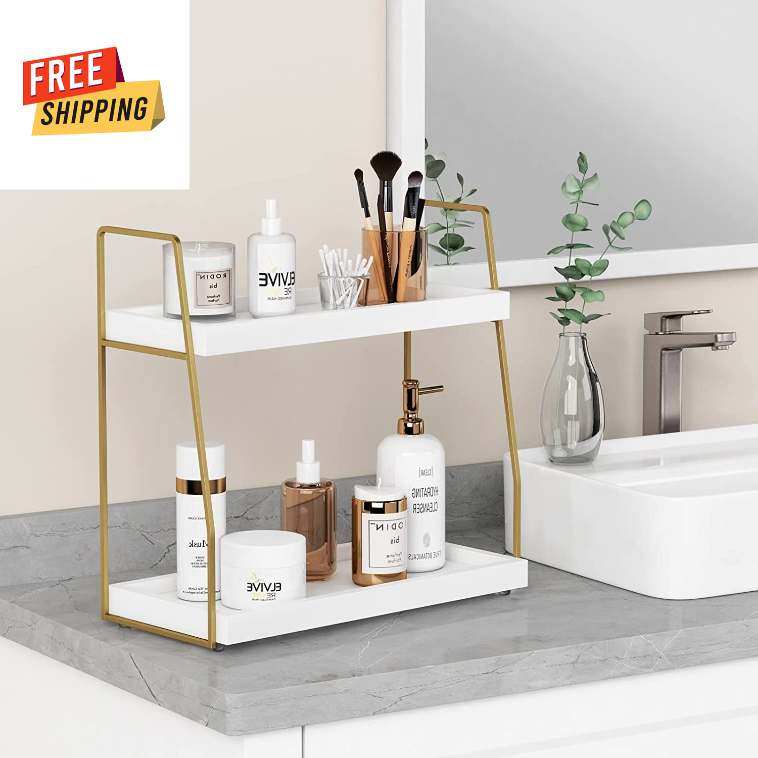 2-Tier White and Gold Bathroom Organizer Countertop - Wooden Sink Organizer Shel