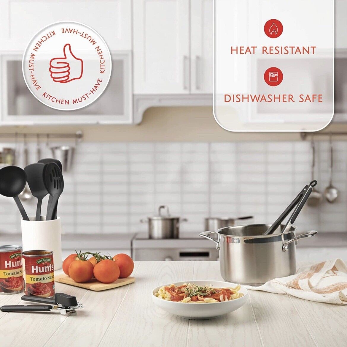 • Cooking Utensils Set Includes: Soup Ladle, Solid Spoon, Slotted Spoon, Solid Turner, Slotted Turner, Potato Pusher, Whisk, Grater, Spatula, Tongs, Can opener, Ice Scream Scooper, Wine Opener, Peeler, Measuring Cups, Measuring spoons.