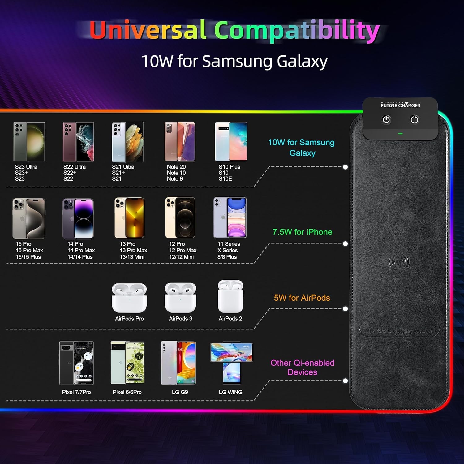 • 【10W Wireless Charging RGB Gaming Mouse Pad】: The RGB Gaming Mouse Pad design with 10W fast wireless charging which is compatible with iPhone 15/14/13/12/11/X/8 Series, Samsung Galaxy S23/S22/S21/S20/S10/Note 9/Note 8, Airpods 3rd/Airpods Pro 2nd/Airpods Pro/Airpods and other devices. So can charge your phone or Airpods when you use the large mouse pad whether you are gaming or working.(NOTE: 10W fast charging need power adapter 9V 2A or other QC3.0/2.0 adapter,the ADAPTER IS NOT INCLUDED)