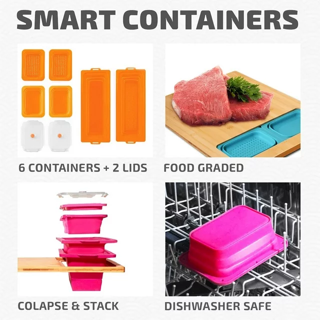 Cut Your Prep Time In Half - We've taken the most functional elements of meal prep cutting board sets and created our prep station cutting board to minimize kitchen clean-up and maximize convenience. We're the over sink cutting board set that offers everything you need to wash, cut, clean, strain, and store. Our 9 piece set features multiple Zenprep containers, strainers, lids, and an aesthetically pleasing cutting board for sink or countertop use with an amazing food prep station.,Keep Your Kitchen Clean: Save valuable counter space with Zenprep wooden cutting board with removable silicone strainers combo. Rinse fruits, veggies and more in the removable silicone strainers on one end and chop them on the other end. The sink cutting board extends to 20 in (50cm), fitting most standard kitchen sinks. The collapsible strainers fit seamlessly within the chopping board to make straining your fruits, veggies or pastas simple. When not using them, simply stack and store.,Innovative Design For Home Cooking - Our smart cutting station allows you to sim neously cut and slide your steak, vegetable, fruits, or meat into containers that can be stacked, air tight and ready for storage or transport. Our chopping boards for kitchen come equipped with a juice groove to keep a tidy and sanitary work space. Enjoy the elegant design with rounded edges and pick from 4 colors: teal, grey, pink and orange to spice up your kitchen scheme!,Amazing Versatility To Meet Your Modern Needs - The 2-in-1 cutting board with tray set is designed to double as the perfect serving platter ideal for serving appetizers and dips. Use it as a serving tray, steak cutting board or an ultimate tidy board all in one. It's never been easier to make fresh, and delicious whole foods a part of your life. The sleek and lightweight design makes lifting, moving and cleaning this reversible cutting board easy for all users, both left and right handed.,Sustainable Bamboo - We sampled over 100 wooden chopping boards and factories to find the perfect supplier, and we found it! A 5 hour drive up into the misty mountains, these artisans take their craft seriously. Our bamboo cutting boards for kitchen are 100% bamboo with a 1 year . With proper care, they last for years. Simply wash with warm water and mild detergent and air dry.